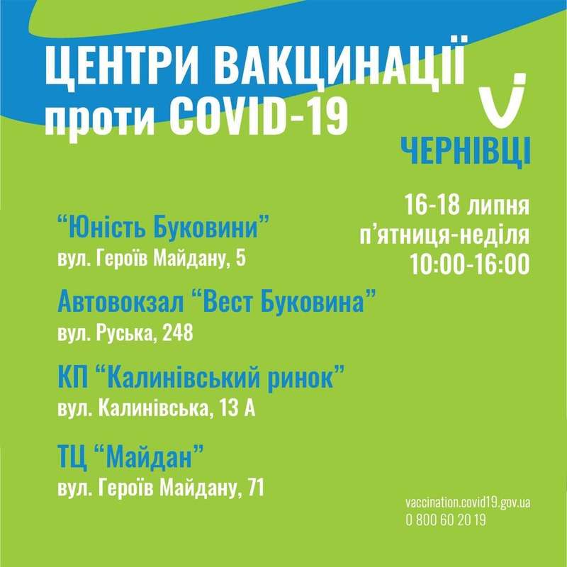 З 16 по 18 липня 2021 року на Буковині працюватимуть 4 центри масової вакцинації. Вони будуть розташовані за адресами:
