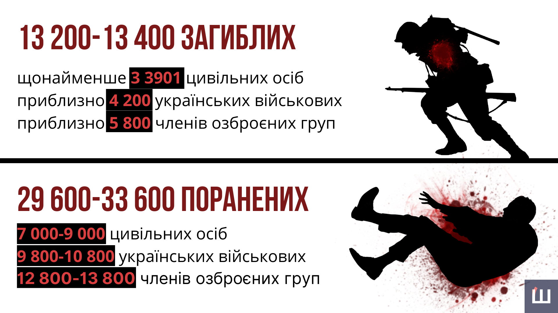 За період з 14 квітня 2014-го до 10 лютого 2020 року УВКПЛ ООН повідомляло про 42 000–44 000 людських втрат.