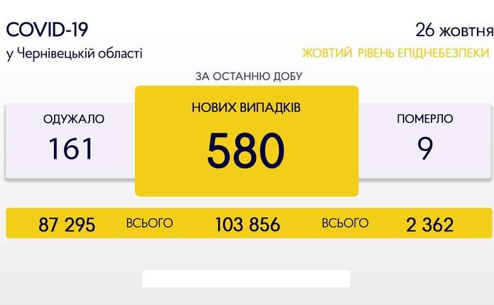 За минулу добу, 26 жовтня 2021 року, на Буковині зафіксовано 580 нових випадків зараження коронавірусом.