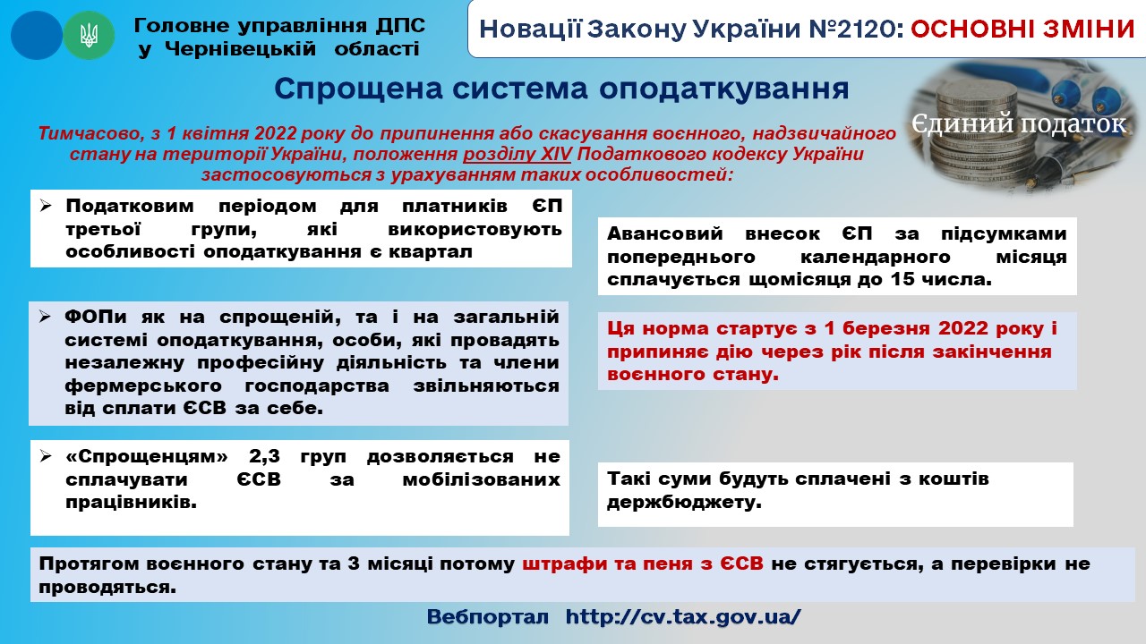 Нормами Закону 2022 визначено, що тимчасово, з 1 квітня 2022 року до припинення або скасування воєнного, надзвичайного стану на території України, положення розділу XIV Податкового кодексу України застосовуються з урахуванням таких особливостей (стаття 9.1 – 9.9):