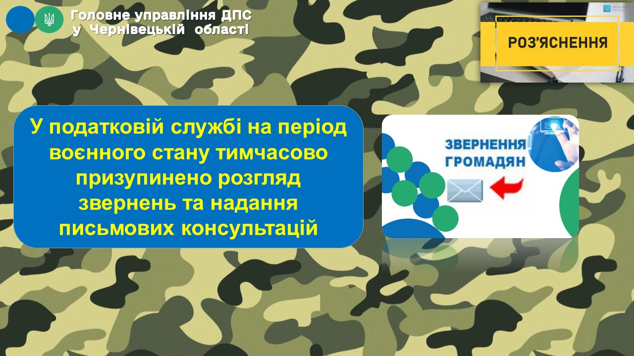 Розгляд звернень та надання індивідуальних податкових консультацій й відповідей на запити на інформацію буде відновлено після припинення або скасування воєнного стану на території України.