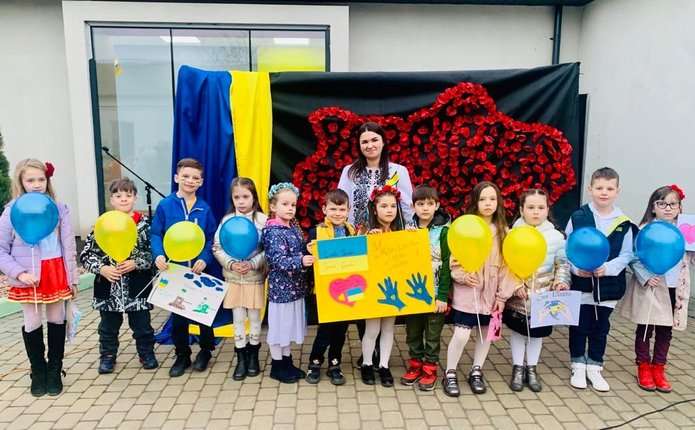 Всі зібралися на шкільному подвір’ї. По завершенні заходу діти випустили у небо голубів. Хвилиною мовчання згадали вбитих українців, які стали жертвами російських агресорів.