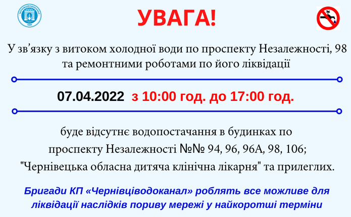 У Чернівцях, в зв’язку із аварійним витоком води на водоводі за адресою проспект Незалежності, 98, буде відсутнє водопостачання з 10.00 до 17.00 години 7 квітня 2022 року за адресами: