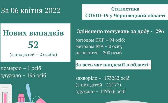 За добу 6 квітня 2022 року в Чернівецькій області зафіксовано 52 нових випадки коронавірусної хвороби COVID-19 (з них дітей – 2, медпрацівників – 6). Про це інформує Чернівецький обласний центр контролю та профілактики хвороб.