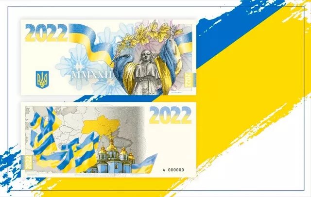 Дизайнеркою даної банкноти є художниця з Чехії Єва Гашкова. На аверсі банкноти вона зобразила Монумент Незалежності, а на реверсі Софійський собор, над яким розвиваються синьо-жовті стяги й виділена Україна на карті Європи. Замість номіналу там вказаний 2022 рік.