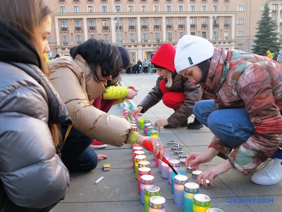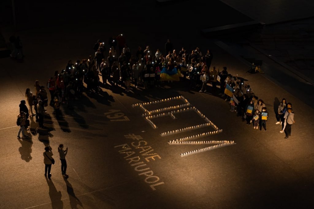 По периметру напису «Діти» виклали та запалили яскраві різнокольорові свічки, на згадку про те, що в Маріупольському театрі ховалося багато дітей. Також свічками виклали слова Save Mariupol Ukraine.