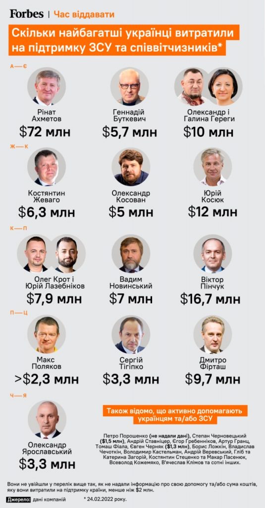 Forbes зʼясував, скільки найбагатші українці дали грошей на протидію російській агресії та підтримку співвітчизників. Видання наголошує, що це не рейтинг і не змагання, а мета проєкту — надихнути всіх підприємців на допомогу країні.