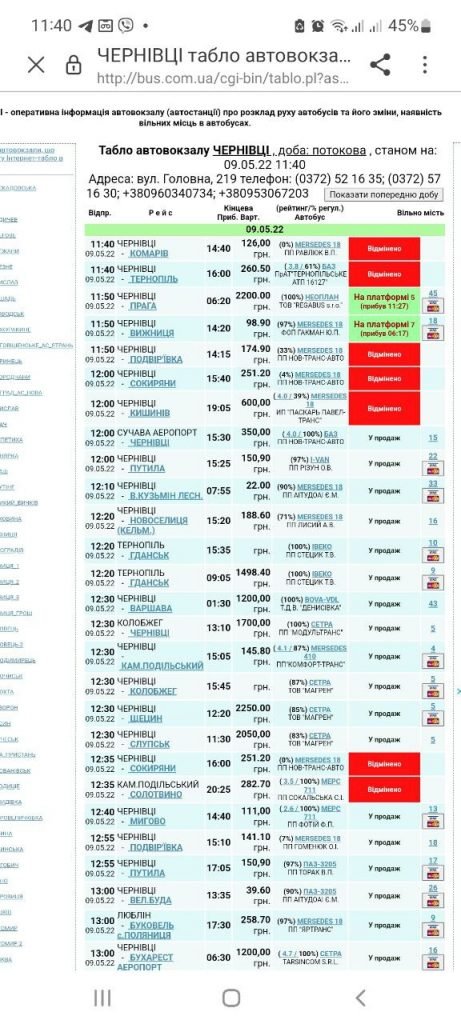 Із Чернівецького автовокзалу сьогодні, 9 травня, скасували десятки внутрішньообласних та міжнародних рейсів. Серед них — автобуси до Кишинева, Тернополя, Солотвина, Ужгорода, Хмельницького, а також до районів: Сокирян, Подвір’ївки, Новодністровська тощо.