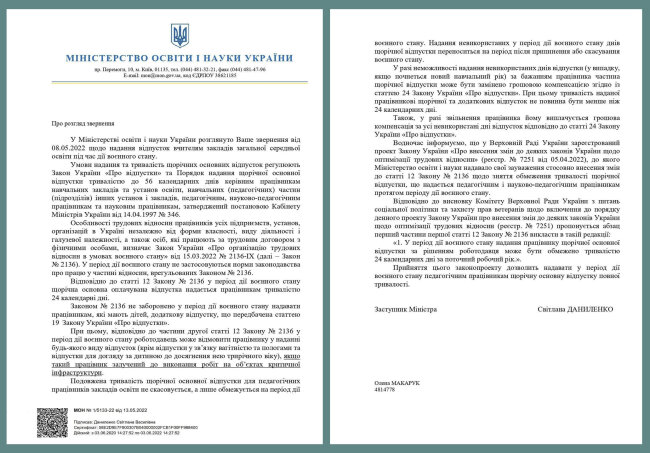 У Міністерстві освіти і науки України розглянули звернення освітян від 8.05.2022 щодо надання відпусток вчителям закладів загальної середньої освіти під час дії воєнного стану.