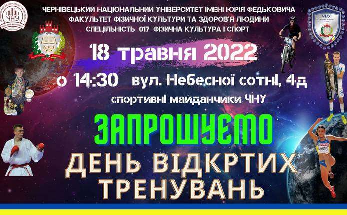 18 травня 2022 року, о 14:30 год., відбудеться день відкритих тренувань, майстер-класи з різних видів спорту, які будуть проходити одночасно на багатофункціональних спортивних майданчиках Чернівецького національного університету імені Юрія Федьковича за участі фахівців, викладачів, майстрів спорту міжнародного класу, майстрів спорту України, асоціації випускників факультету фізичної культури та здоров’я людини. Про це повідомляють на офіційному сайті навчального закладу.