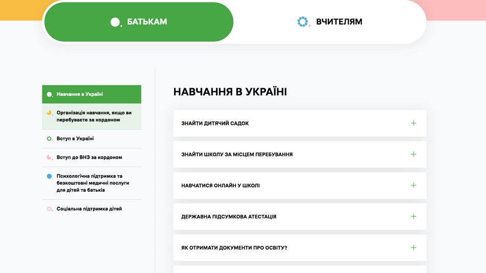Зокрема на сайті можна знайти відповіді на питання: як знайти дитячий садочок, школу за місцем перебування, навчатися онлайн у школі, отримати документи про освіту тощо. Також про вступ до ВНЗ за кордоном, а ще психологічну підтримку та безкоштовні медичні послуги для батьків та дітей.