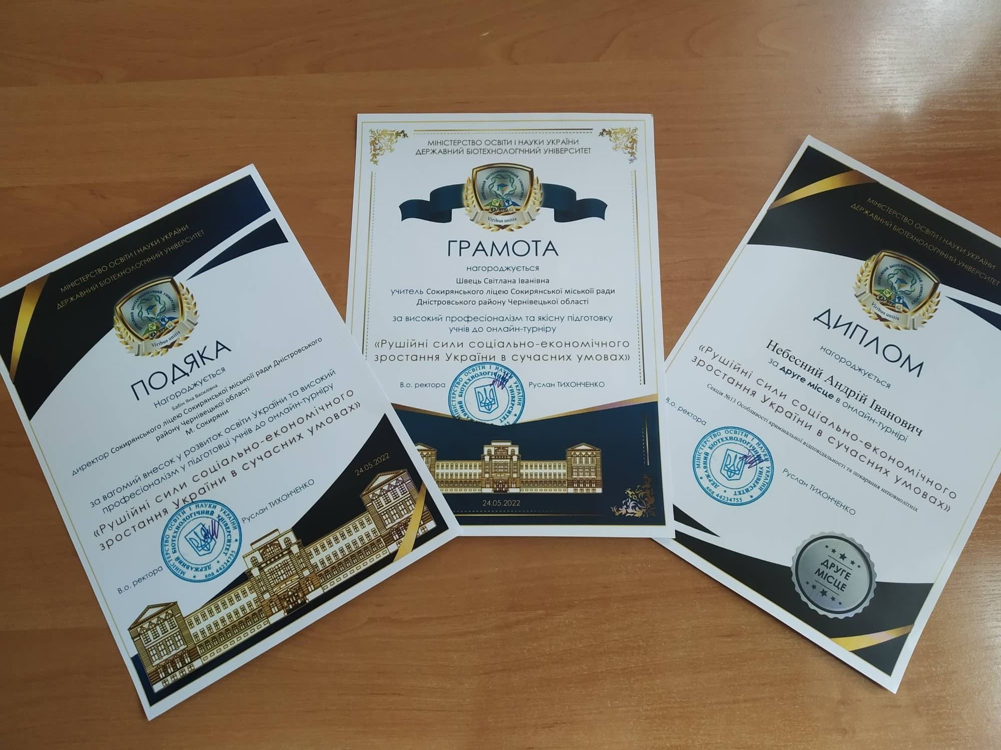Сокирянський ліцей, на запрошення Державного біотехнологічного університету, взяв активну участь в онлайн турнірі «Рушійні сили соціально-економічного зростання України в сучасних умовах».