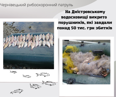 10 червня 2022 року на Дністровському водосховищі, в адміністративних межах с.Коновка Дністровського району Чернівецької області, при здійсненні рибоохоронних заходів державними інспекторами Чернівецького рибоохоронного патруля спільно з працівниками Дністровського РВП ГУНП в Чернівецькій області, було затримано двох громадян, які здійснювали в нерестовий період незаконний вилов водних біоресурсів з гумового човна забороненими знаряддями лову, а саме сіткою ставною в кількості дві штуки.