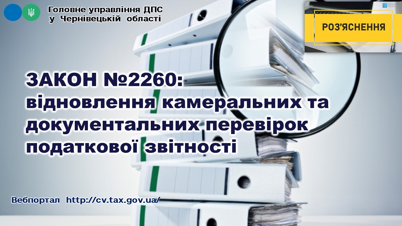 Законом України № 2260-IX «Про внесення змін до Податкового кодексу України та інших законів України щодо особливостей податкового адміністрування податків, зборів та єдиного внеску під час дії воєнного, надзвичайного стану» внесено зміни до Податкового кодексу України щодо відновлення перевірок. Про це інформують у Головному управлінні ДПС у Чернівецькій області.