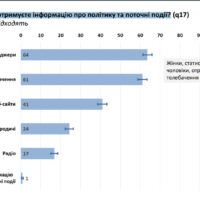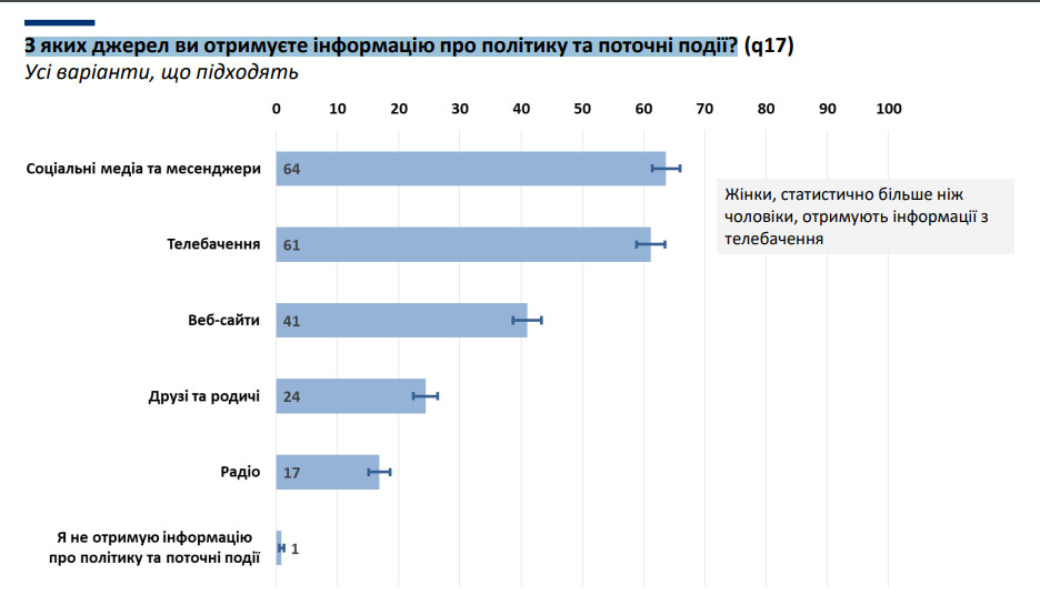 Щодо джерел з яких люди отримують інформацію про політику та поточні події – найбільший відсоток був відданий соціальним медіа та месенджерам – 64%, телебачення – 60%, вебсайти – 40%.