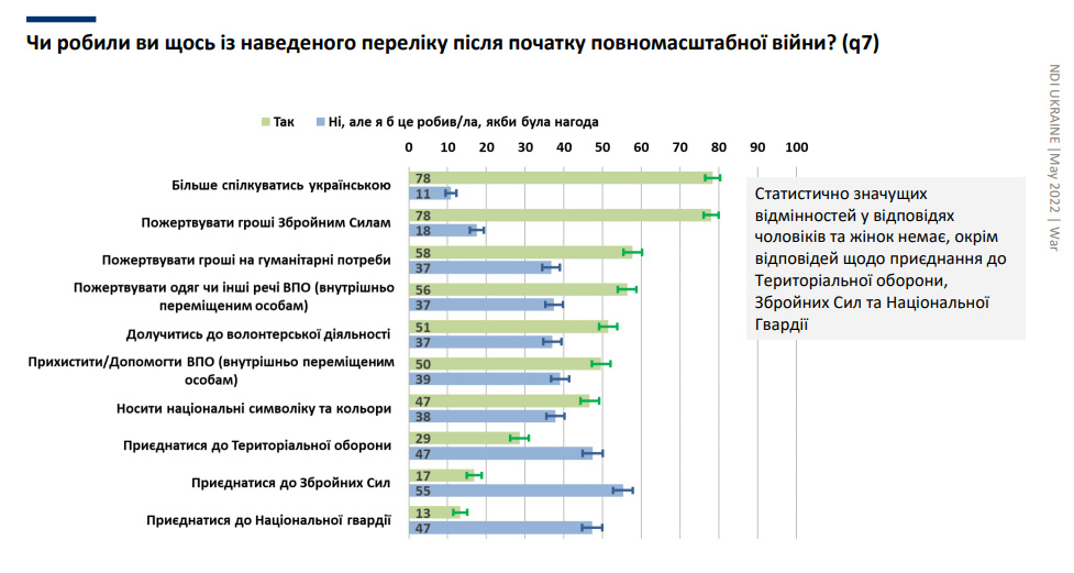 Також з початком повномасштабної війни більше громадян перейшли на українців мову. Цей показник сьогодні на рівні 78% – вказується у опитуванні. Такий же показник пожертв коштів для ЗСУ.