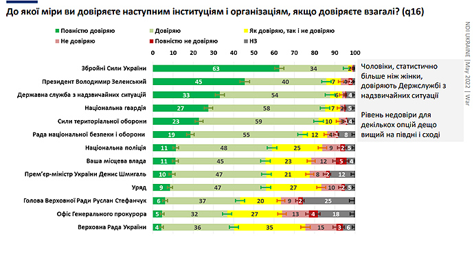 Дослівно соціологи: «97% відсотків довіряють або повністю довіряють Збройним силам України, а 85 % довіряють президенту Володимиру Зеленському» – йдеться у опитуванні.