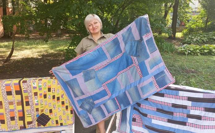 Майстриня у Чернівцях з клаптиків тканин і непотрібного одягу робить покривала на палети