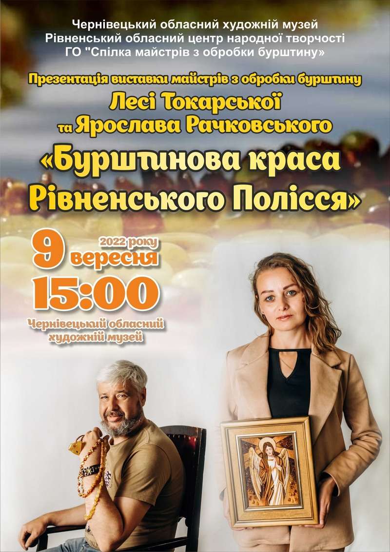 9 вересня 2022 р. в Чернівецькому обласному художньому музеї відбудеться відкриття виставки майстрів з обробки бурштину Лесі Токарської та Ярослава Рачковського «Бурштинова краса Рівненського Полісся». Відкриття експозиції проходитиме з 15.00 до 16.00 год. Сама виставка триватиме з 9 до 26 вересня.