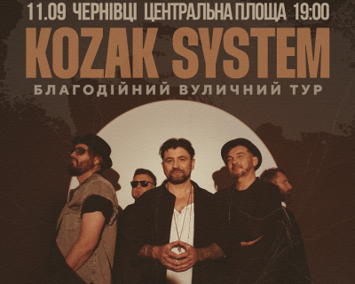 Завтра у Чернівцях на Центральній площі о 19:00 відбудеться безкоштовний концерт гурту “KOZAK SYSTEM” в рамках благодійного вуличного туру, на якому збиратимуть кошти для ЗСУ.