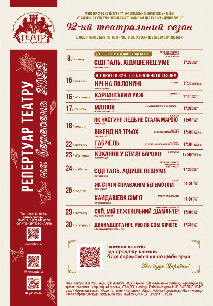Упродовж вересня у театрі зіграють уже відомі вистави. Серед них: «Малюк», «Вікенд на трьох», «Кохання у стилі бароко», «Кайдашева сім’я» та інші.
