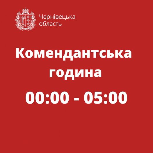 Відповідно до наказу Чернівецької обласної військової адміністрації, з 17 вересня 2022 року на території Чернівецької області ЗАПРОВАДЖЕНО комендантську годину з 00 години 00 хвилин до 05 години 00 хвилин та режим світломаскування.