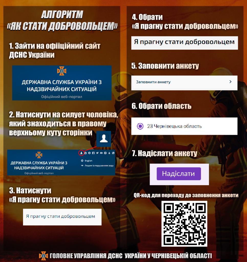 Реєстрація бажаючих долучитися до діяльності добровільних формувань цивільного захисту може здійснюватися на офіційному веб-порталі ДСНС – «Добровільна та місцева пожежна охорона» (dmpo.dsns.gov.ua) в розділі «Я прагну стати добровольцем» шляхом заповнення відповідної анкети, або безпосередньо в місцевих державних адміністраціях, органах місцевого самоврядування.