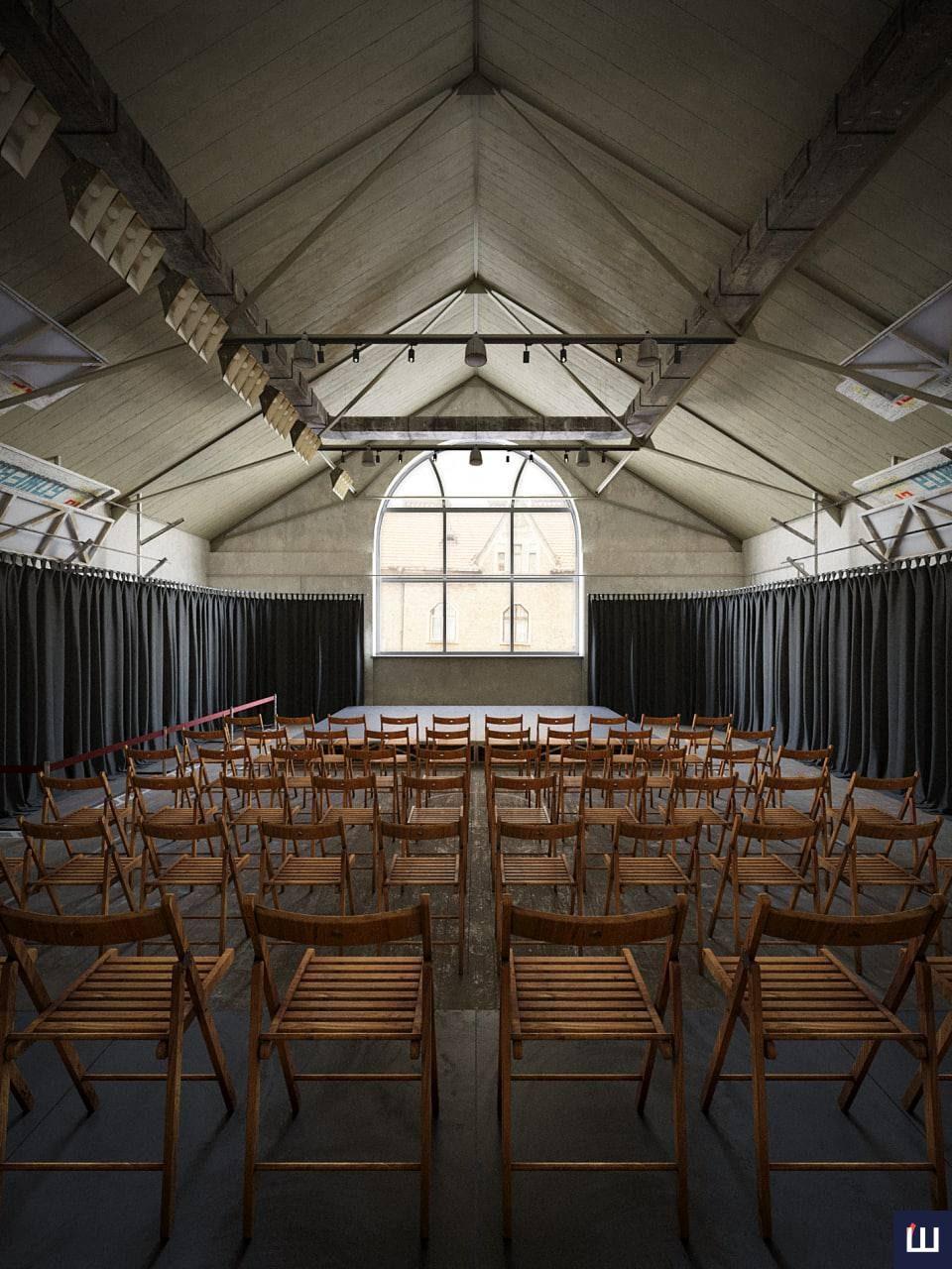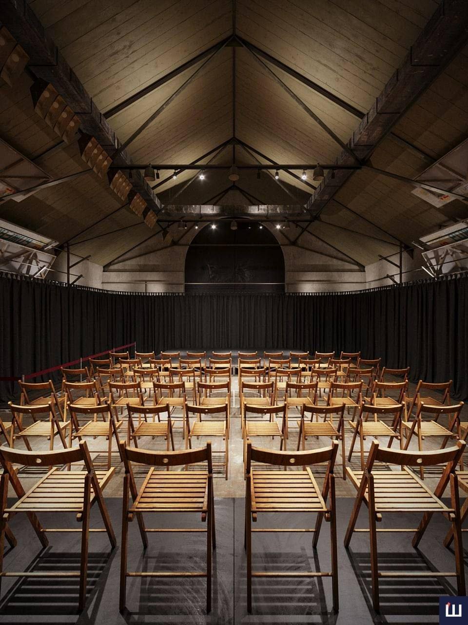 Сцена може вмістити до 100 глядачів, але все залежатиме від формату заходу й вистави. Якщо, наприклад, це велика за форматом декорація, то, можливо, доведеться зменшити кількість глядачів. А якщо ж це буде зустріч із драматургом, то облаштують додаткові місця.