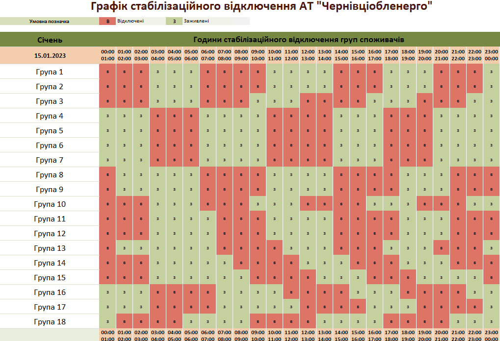 Чернівціобленерго оприлюднило графік вимкнень електропостачання в області на сьогодні, 15 січня. Про це йдеться на сайті компанії.