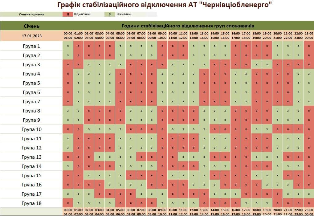 У Чернівецькій області оприлюднили оновлену таблицю з графіком погодинних вимкнень електрики на 17 січня. Про це йдеться на сайті «Чернівціобленерго».