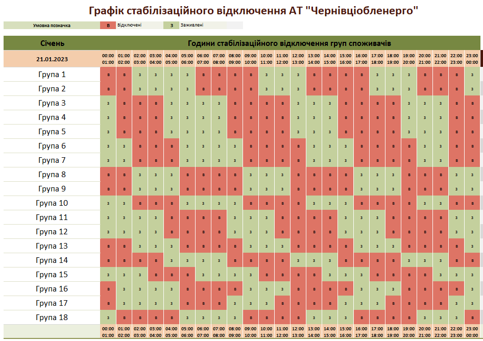 У Чернівецькій області оприлюднили графік стабілізаційних вимкнень електроенергії на сьогодні, 21 січня. Про це повідомляють в АТ «Чернівціобленерго».