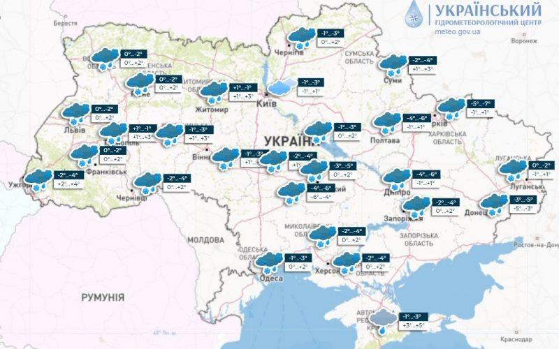 Вночі у західних, північних, більшості центральних областей, вдень в Україні, невеликий сніг з дощем; місцями ожеледь, на дорогах подекуди ожеледиця.