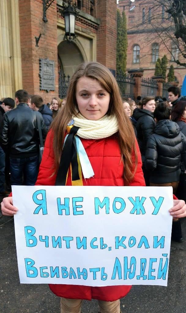 Юлія з плакатом у Чернівцях під час перших розстрілів у Києві.