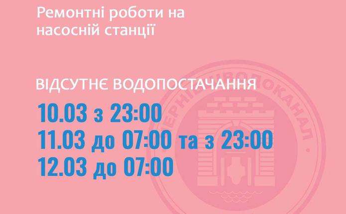 На одній із насосних станцій тривають ремонтні роботи. Щоб не відключати воду протягом дня, наступні дві ночі у Чернівцях будуть обмежувати водопостачання. Про це повідомляє комунальне підприємство “Чернівціводоканал”.