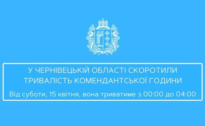 Відтак Рада оборони Чернівецької області ухвалила рішення, що комендантська година на Буковині з 15 квітня триватиме з 00:00 до 04:00. Про це на сторінці у фейсбук повідомив начальник Чернівецької ОВА Руслан Запаранюк.