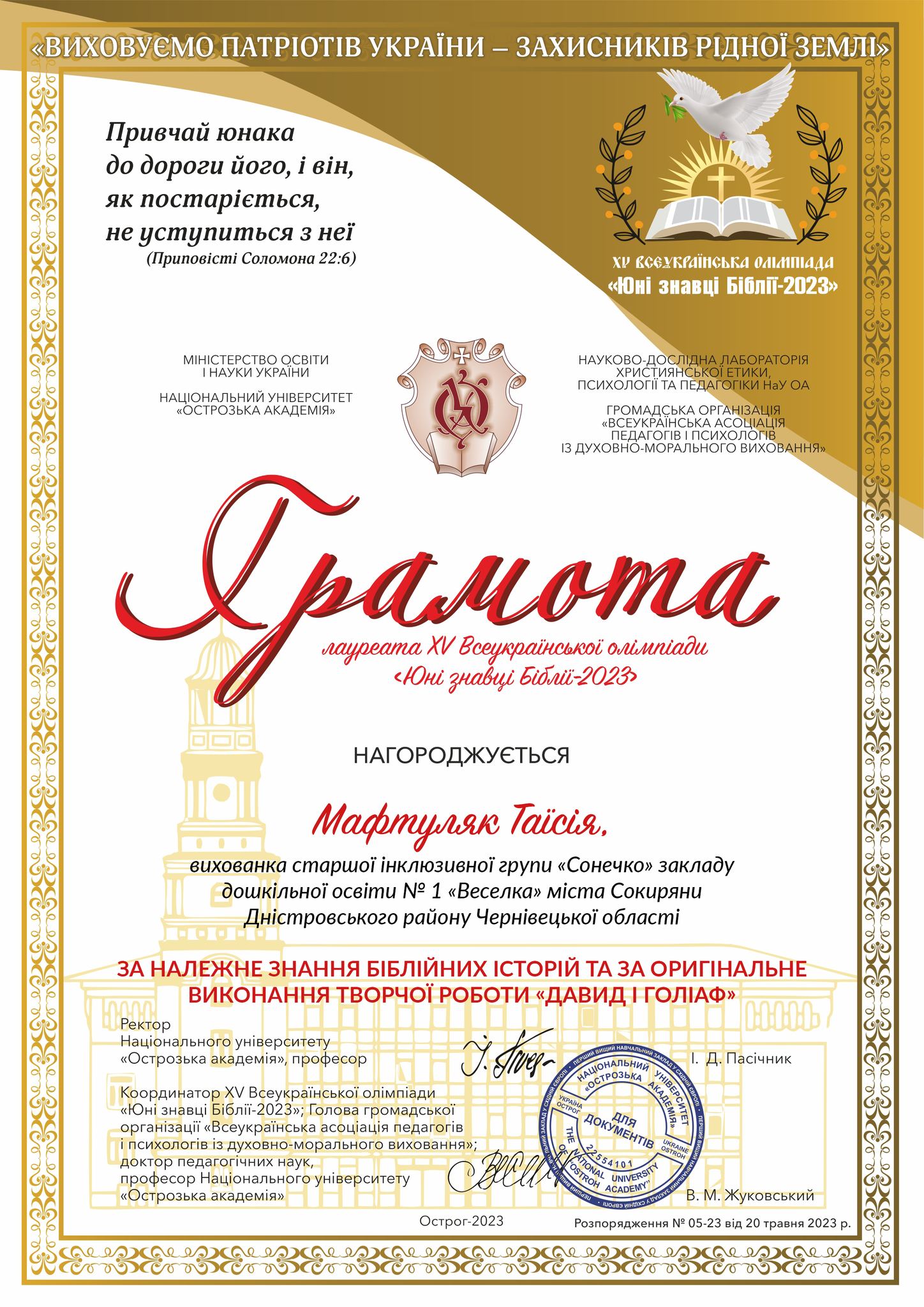 За належне знання біблійних історій та за оригінальне виконання творчої роботи «Давид і Голіаф» Грамотою лауреата відзначено Таїсію Мафтуляк, вихованку старшої інклюзивної групи «Сонечко» закладу дошкільної освіти №1 «Веселка» міста Сокиряни.