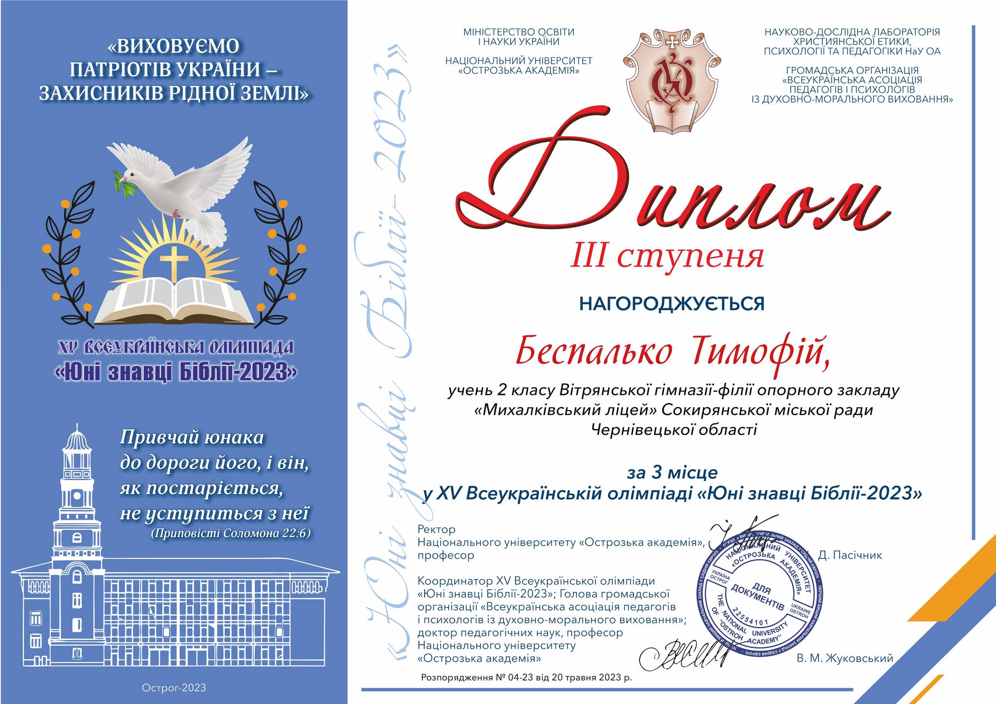 Нещодавно підбито підсумки ХV Всеукраїнської олімпіади «Юні знавці Біблії – 2023», яка проходила на базі Національного університету «Острозька академія» в онлайн-форматі.