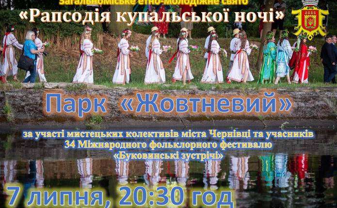 Управління культури Чернівецької міської ради запрошує на етно-молодіжне свято «Рапсодія купальської ночі» за участі мистецьких колективів громади та учасників 34 Міжнародного фольклорного фестивалю «Буковинські зустрічі».