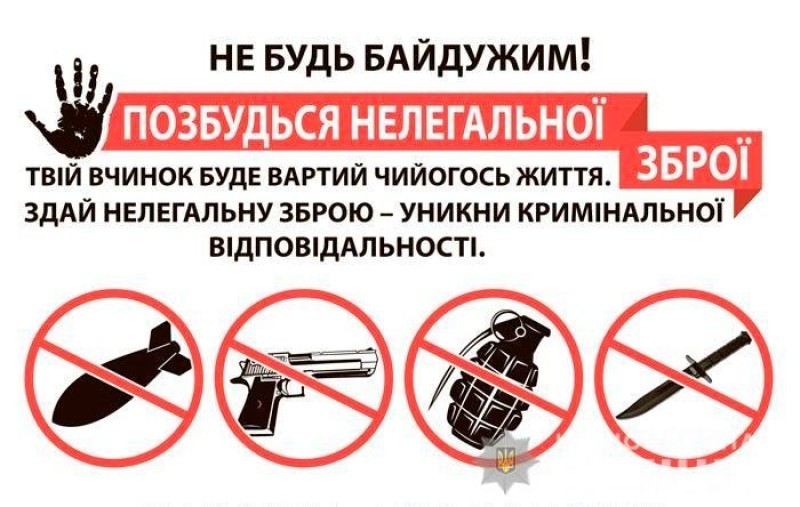 Поліцейські застерігають громадян, що за носіння, зберігання, придбання, передача чи збут вогнепальної зброї (крім гладкоствольної мисливської), бойових припасів, вибухових речовин або вибухових пристроїв без передбаченого законом дозволу – відповідно до частини 1 статті 263 (Незаконне поводження зі зброєю, бойовими припасами або вибуховими речовинами) Кримінального Кодексу України передбачене покарання у вигляді позбавлення волі строком до 7 років.