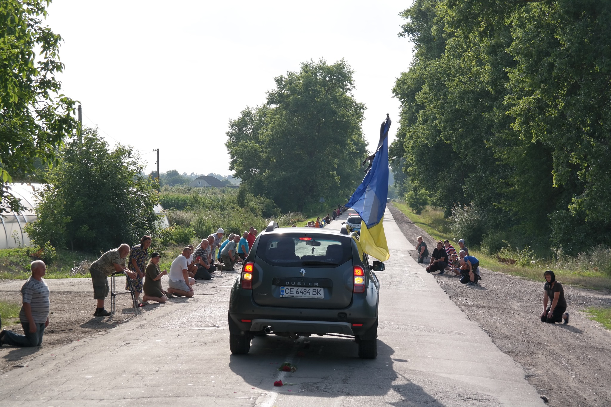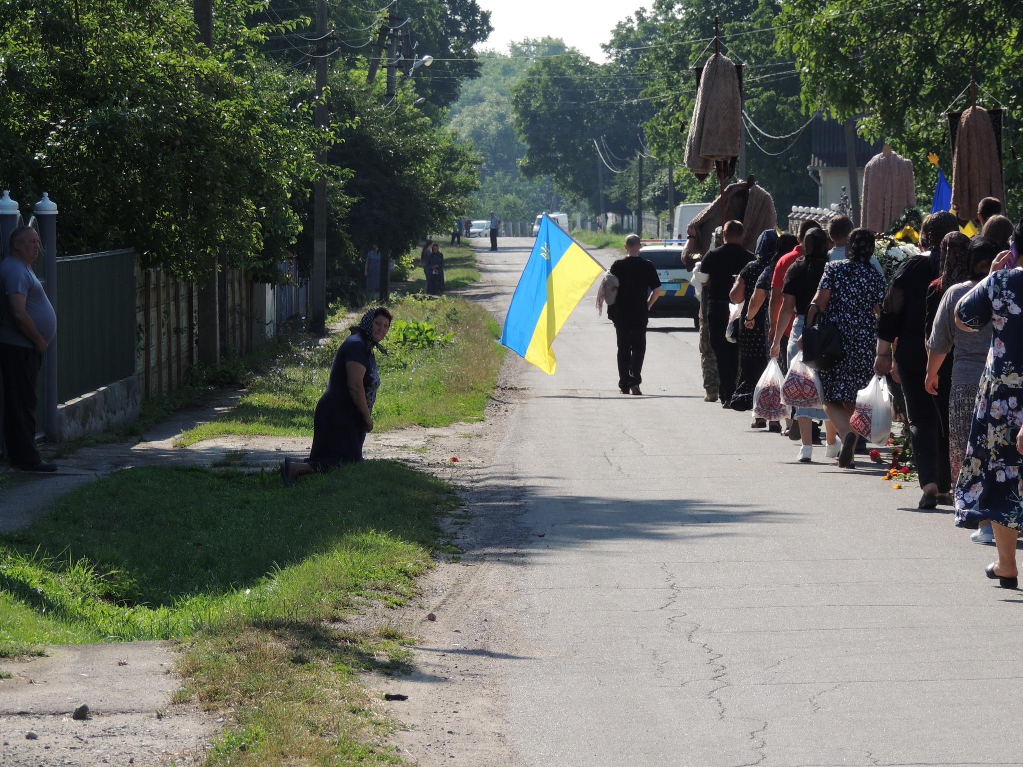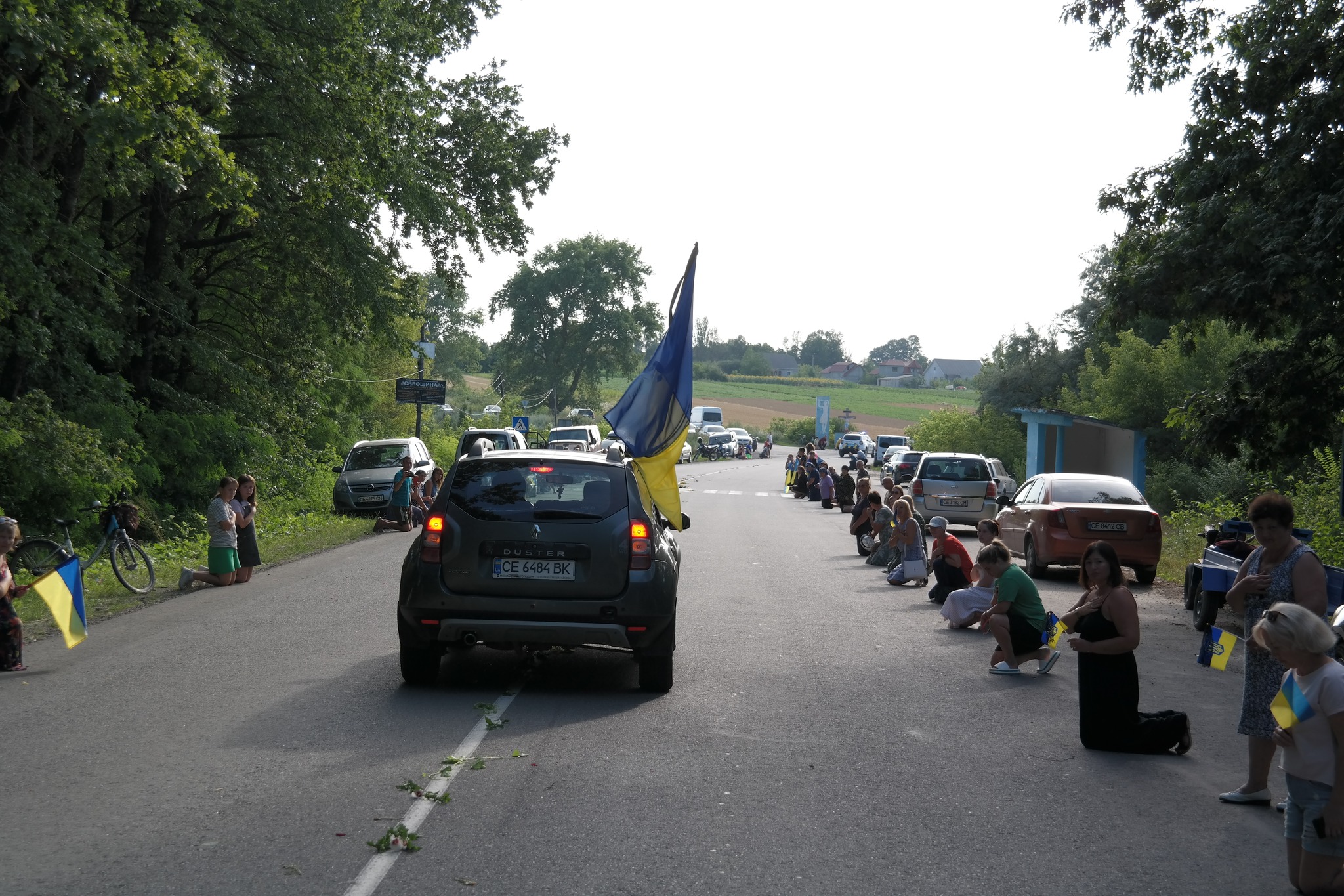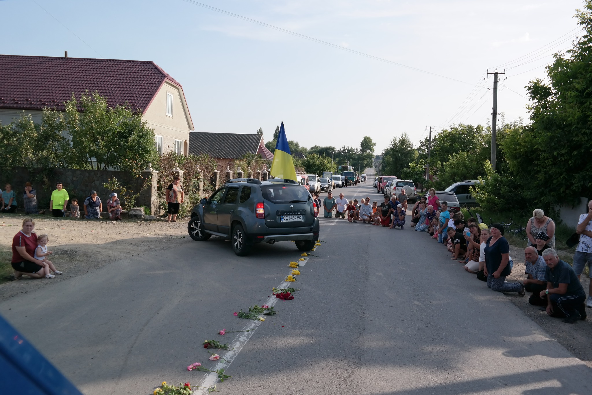 Схиливши голови у скорботі, жителі громади проводжали військовослужбовця за всіма військовими почестями, утворивши живий коридор з синьо-жовтими прапорами, ставши у повазі й вдячності на коліна.