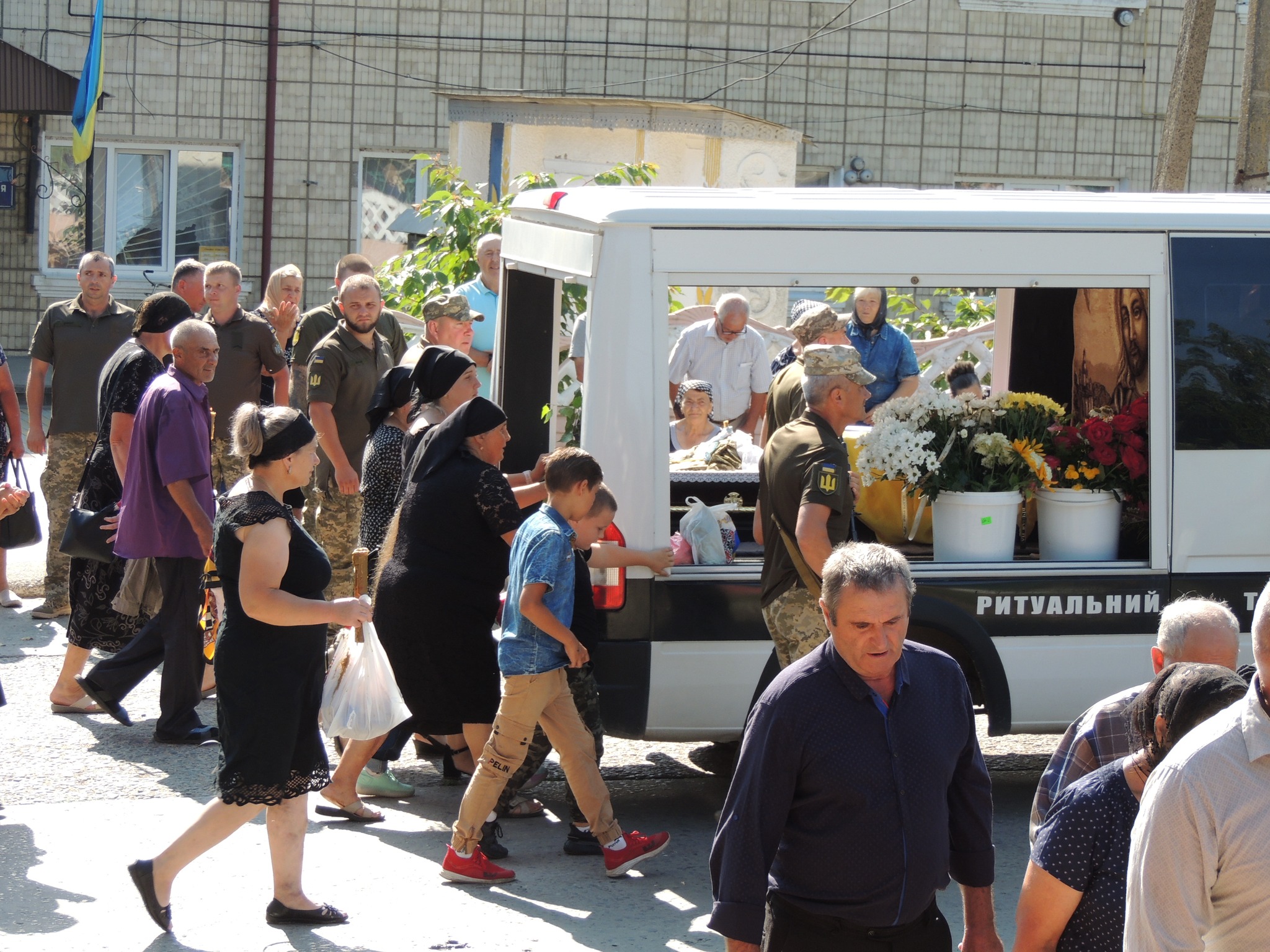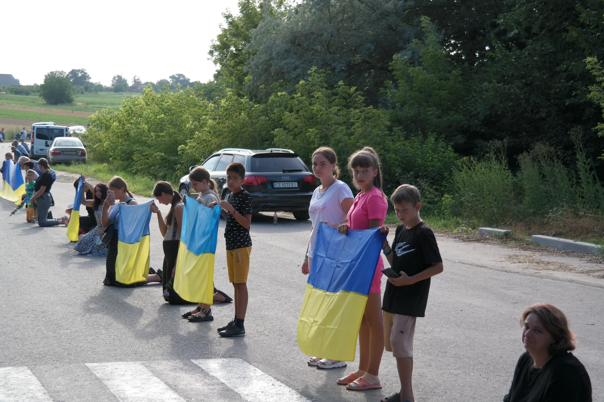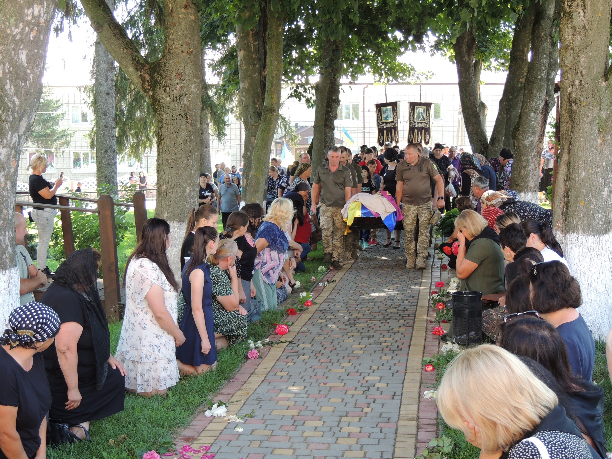 Схиливши голови у скорботі, жителі громади проводжали військовослужбовця за всіма військовими почестями, утворивши живий коридор з синьо-жовтими прапорами, ставши у повазі й вдячності на коліна.