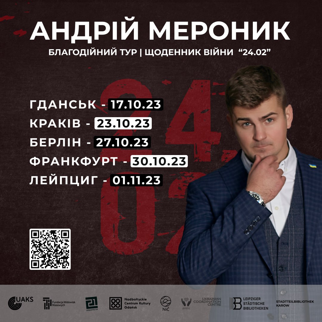 У жовтні стартує тур автора книжки п’ятьма містами Польщі й Німеччини. Так, він відвідає Гданськ, Краків, Берлін, Лейпциг та Франкфурт-на-Майні. У цих містах Андрій Мероник розповість про те, як вдалося долучити до написання цієї книжки «зірок», чому видання купували за 10 тисяч гривень, навіщо солдати брали з собою цю книжку в окопи, як «24.02» потрапила у судове провадження на Черкащині та чому після написання книги автор став справжнім хіпстером.
