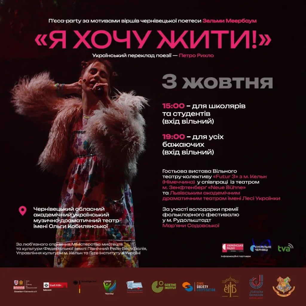 Прем’єра німецько-української вистави «Я хочу жити!» відбудеться в Чернівцях сьогодні, 3 жовтня. Про це повідомляє Чернівецький обласний академічний український музично-драматичний театр. П’єса створена за мотивами віршів чернівецької поетеси Зельми Меербаум у перекладі Петра Рихла.
