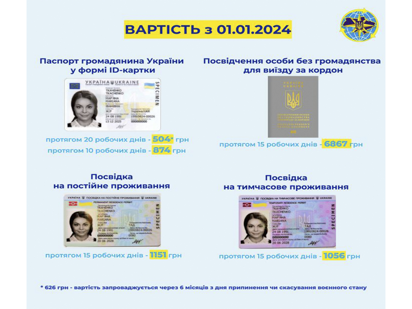 З 1 січня 2024 року ДП «Поліграфічний комбінат «Україна» змінено вартість бланків окремих біометричних документів. У зв’язку з цим зростала і загальна вартість оформлення паспорта громадянина України у формі ID-картки,  посвідки на тимчасове або постійне проживання в Україні, а також посвідчення особи без громадянства для виїзду за кордон.