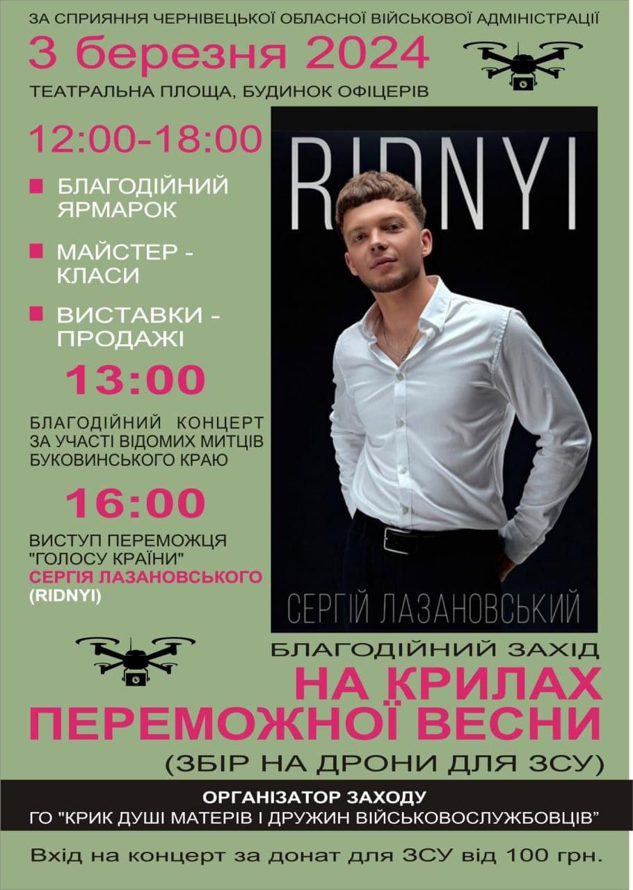 На заході відбудеться благодійний ярмарок, майстер-класи, а також концерт за участі буковинських митців та переможця «Голосу країни» Сергія Лазановського.