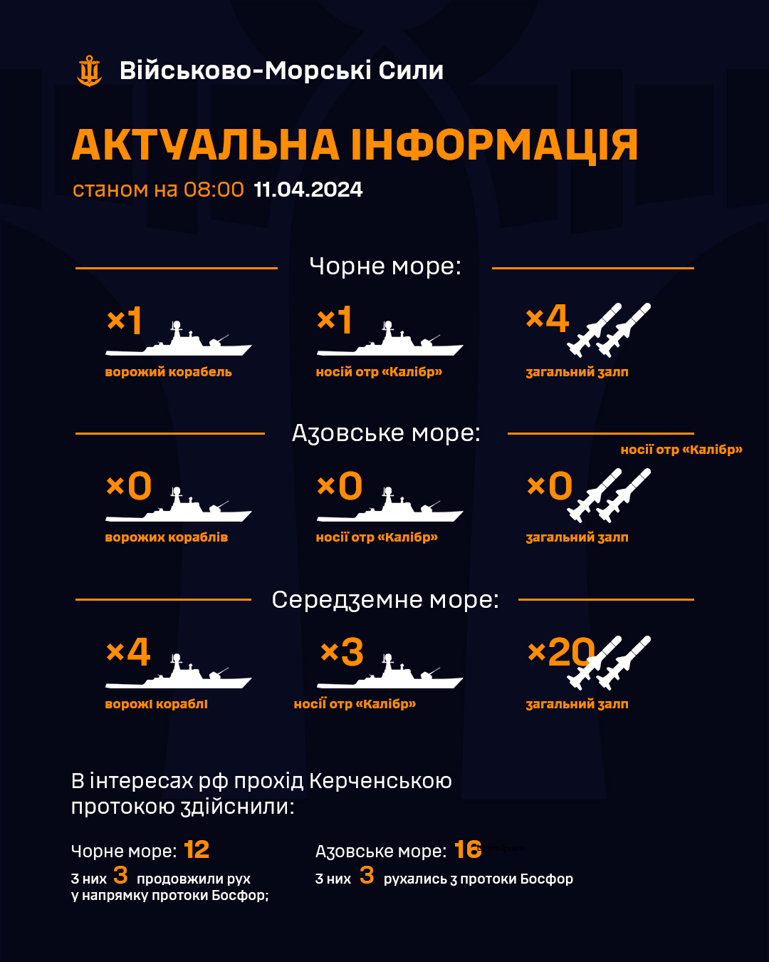 В акваторії Чорного моря станом на 8:00 четверга, 11 квітня перебуває один російський носій крилатих ракет "Калібр" – загальний залп до чотирьох ракет.