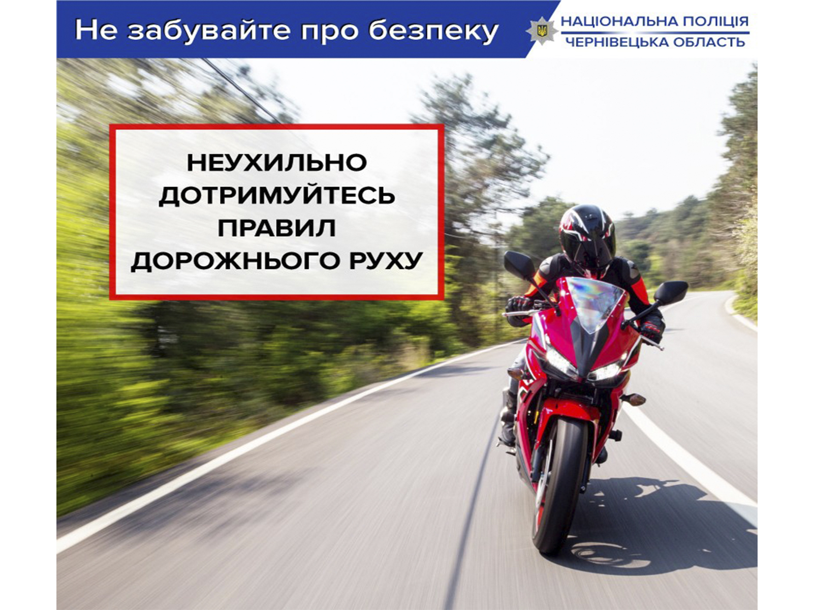Співробітники поліції Буковини закликають водіїв двоколісних транспортних засобів бути обачними та неухильно дотримуватись правил безпеки на дорозі: