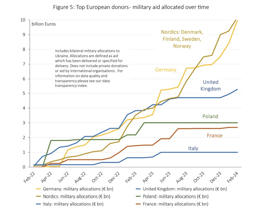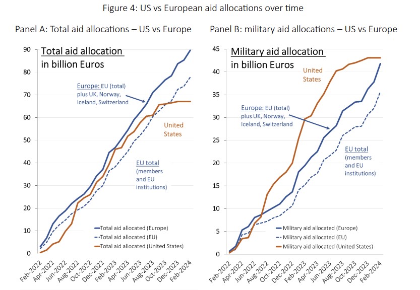 Загалом станом на 29 лютого донори та ЄС виділили 89,9 млрд євро допомоги на військову, гуманітарну та фінансову підтримку України, з них США – 67 млрд євро. Водночас з літа 2023 року асигнування Європи стабільно перевищували надходження від США, оскільки Конгрес більше року не схвалював жодної нової допомоги Україні.