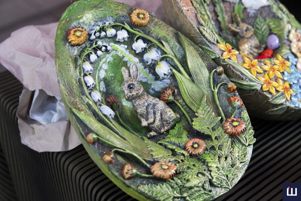 Останніми торгувала продавчиня Регіна. Вона розповідає, що це вироби її мами Галини, які та виготовляє вже декілька років. Всередині яйця виготовлені з пінопласту, а ззовні – з самозастигаючої глини. Чотири роки тому від раку помер її чоловік, тож Галина намагалася знайти розраду у творчости. Окрім того, вона пише картини та робить розпис на тканині й пляшках.