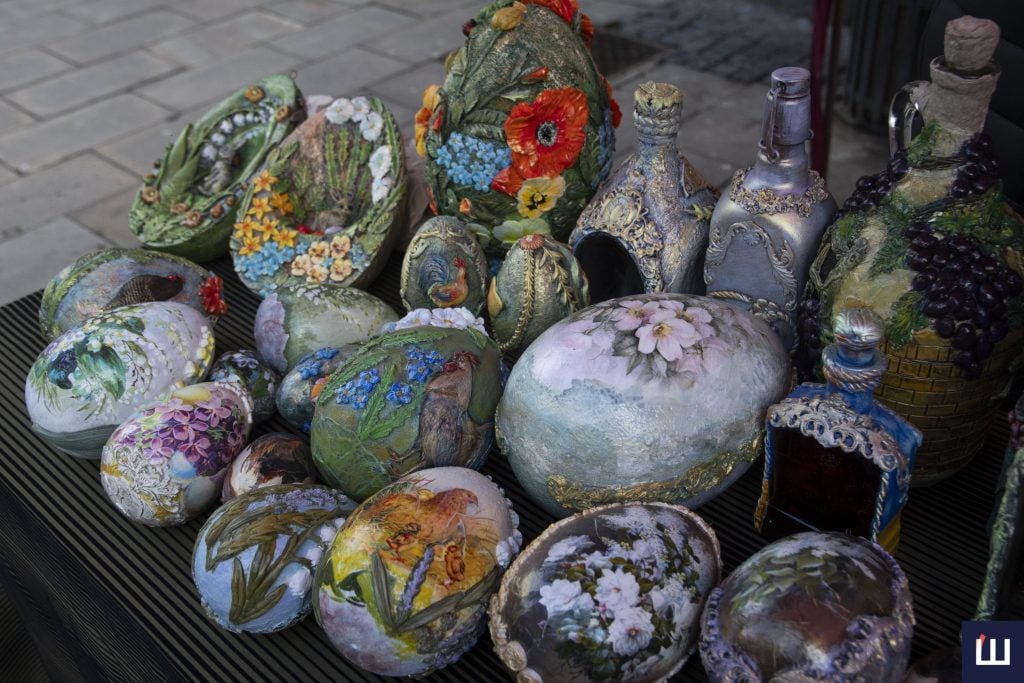 Народні майстри та майстрині продавали саморобні вироби: бісерні прикраси, свічки у формі писанок, вишиті хустки та сорочки, вироби з дерева, сувенірні великодні яйця.